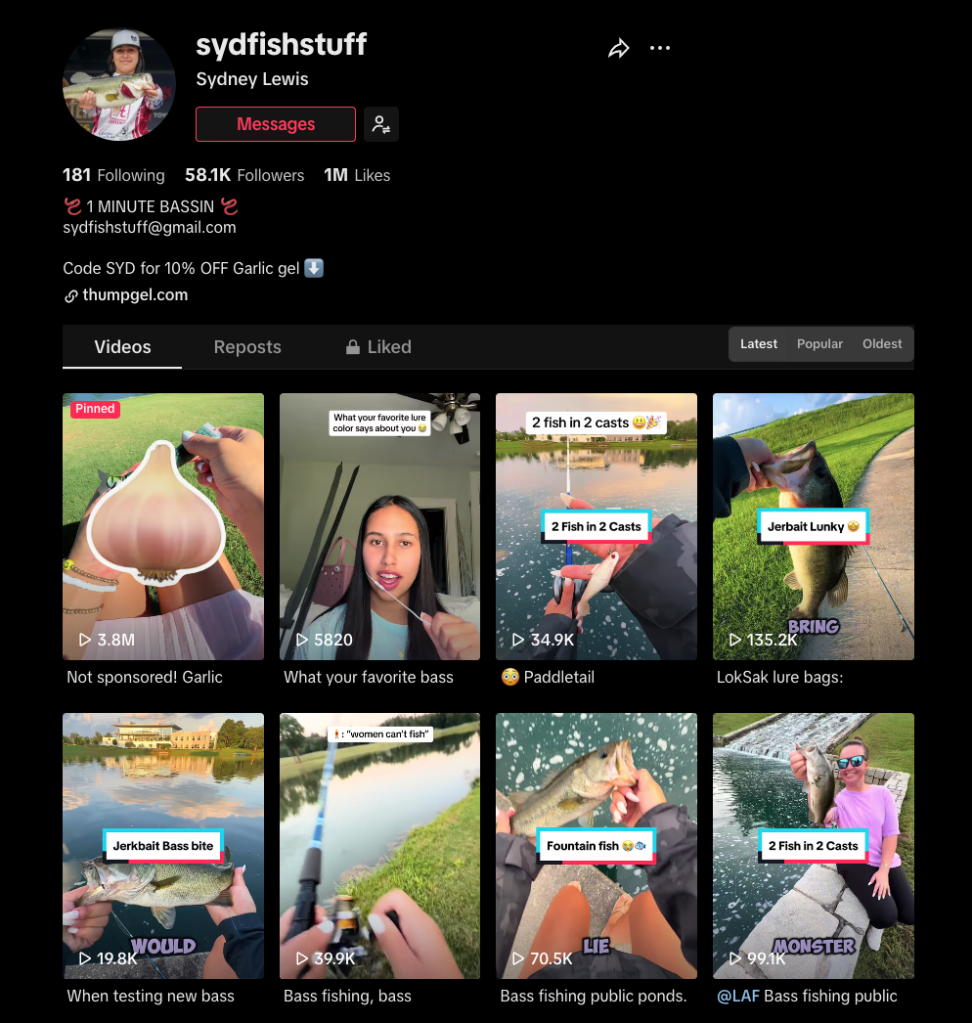 Sydney employs several unique techniques to build her fanbase and keep her content engaging. She creates themed videos such as “What Your Favorite Fishing Lure Says About You,” where she predicts viewers’ personality traits based on their lure preferences. This format entices many comments and interactions.