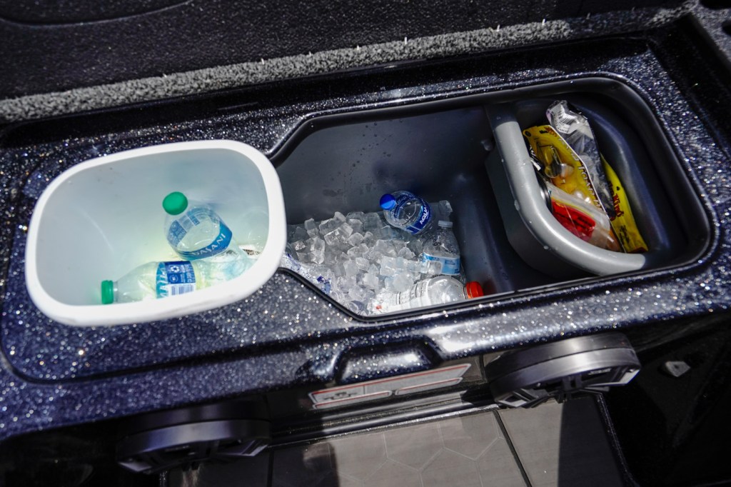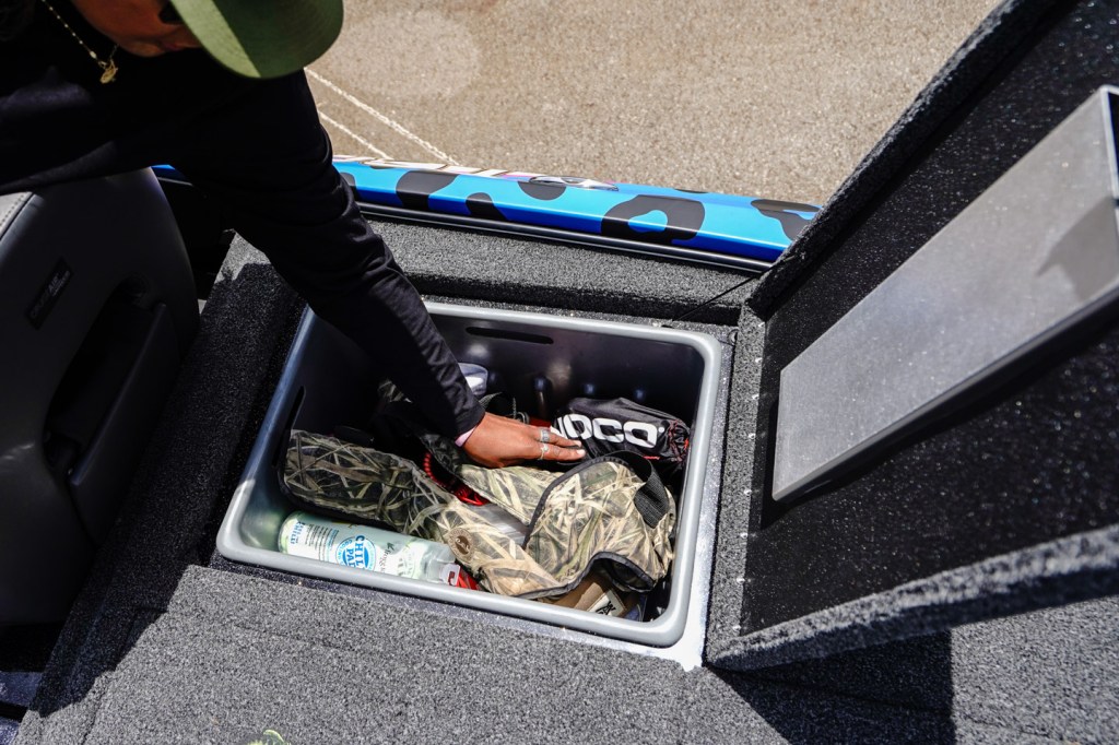 The central compartment is packed with gear. The Full Tackle Storage is the ultimate treasure chest of fishing goodies.