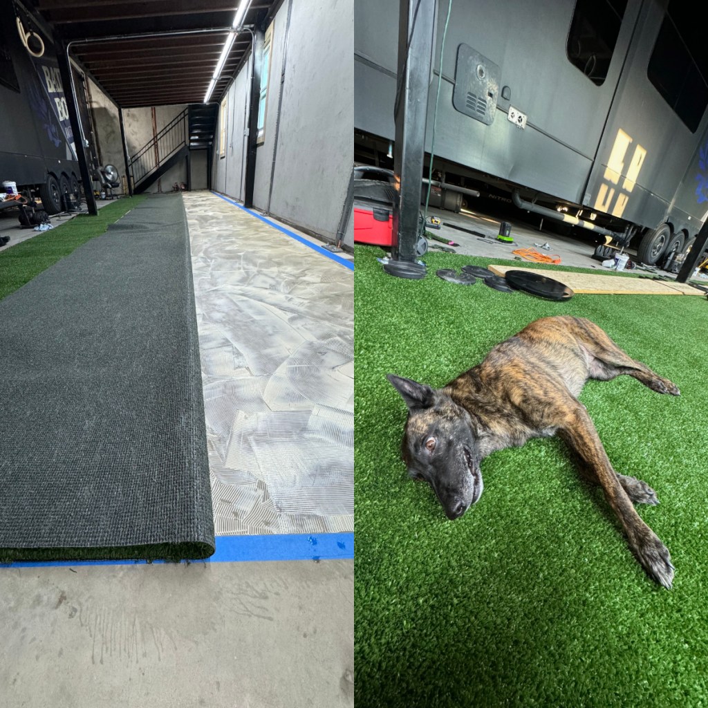 Installing the 600-pound roll of turf has been quite a workout in itself. I’ve had to shove the turf around while troweling the adhesive onto the floor. Because the fitness area is readily accessible in our shop it should provide a strong incentive to get after it.
