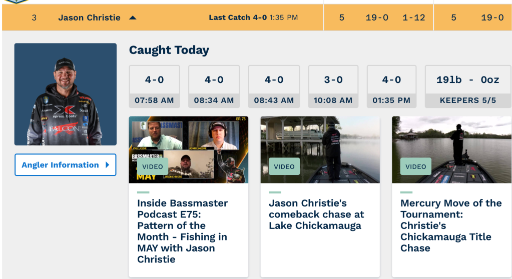 Jason Christie is pouring it on late, capitalizing on an already solid morning. His last fish came in at a guesstimated 4-pounds even. The same as his first three fish, all 4-pounds even. The likelihood that he’s caught four identical 4- pounders is slim to none, and it’s more likely that these 4-pounders are more like 4- and half to 5- pounders knowing Christie.