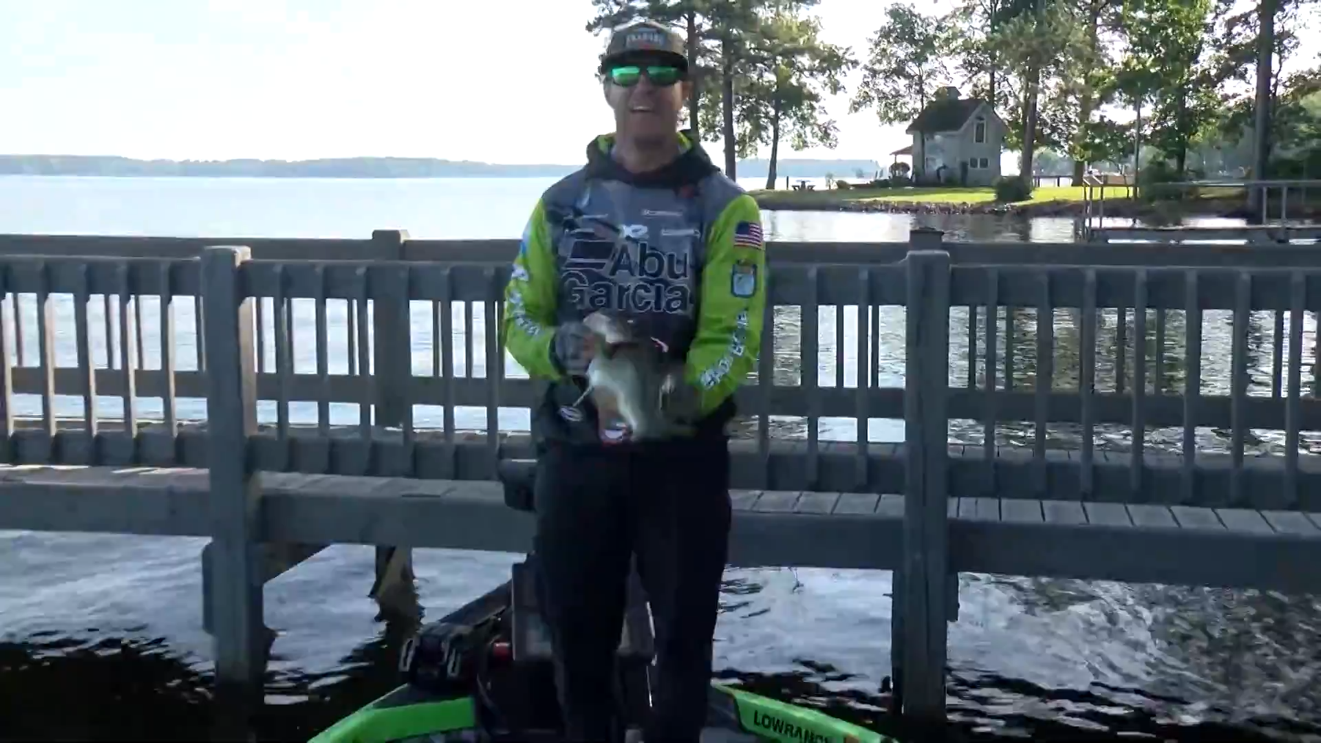 Hunter Shryock has had some all-out battles with bass this week. One of the most epic happened on Day 2 when he wrangled a 5-pounder out from under a dock with a spinning rod. He just one-upped himself. Shryock hooked what looked like a good fish on a wacky rig under a walkway. The fish took off between the dock posts and any likelihood of ever seeing the fish seemed gone. But Shryock held onto hope. He went up to the dock, tried to lead the bass back through the labyrinth, finally gave up a minute in, and slid his rod through the posts. Then stood up, pulled the fish to the boat, and lipped the 7-pounder.