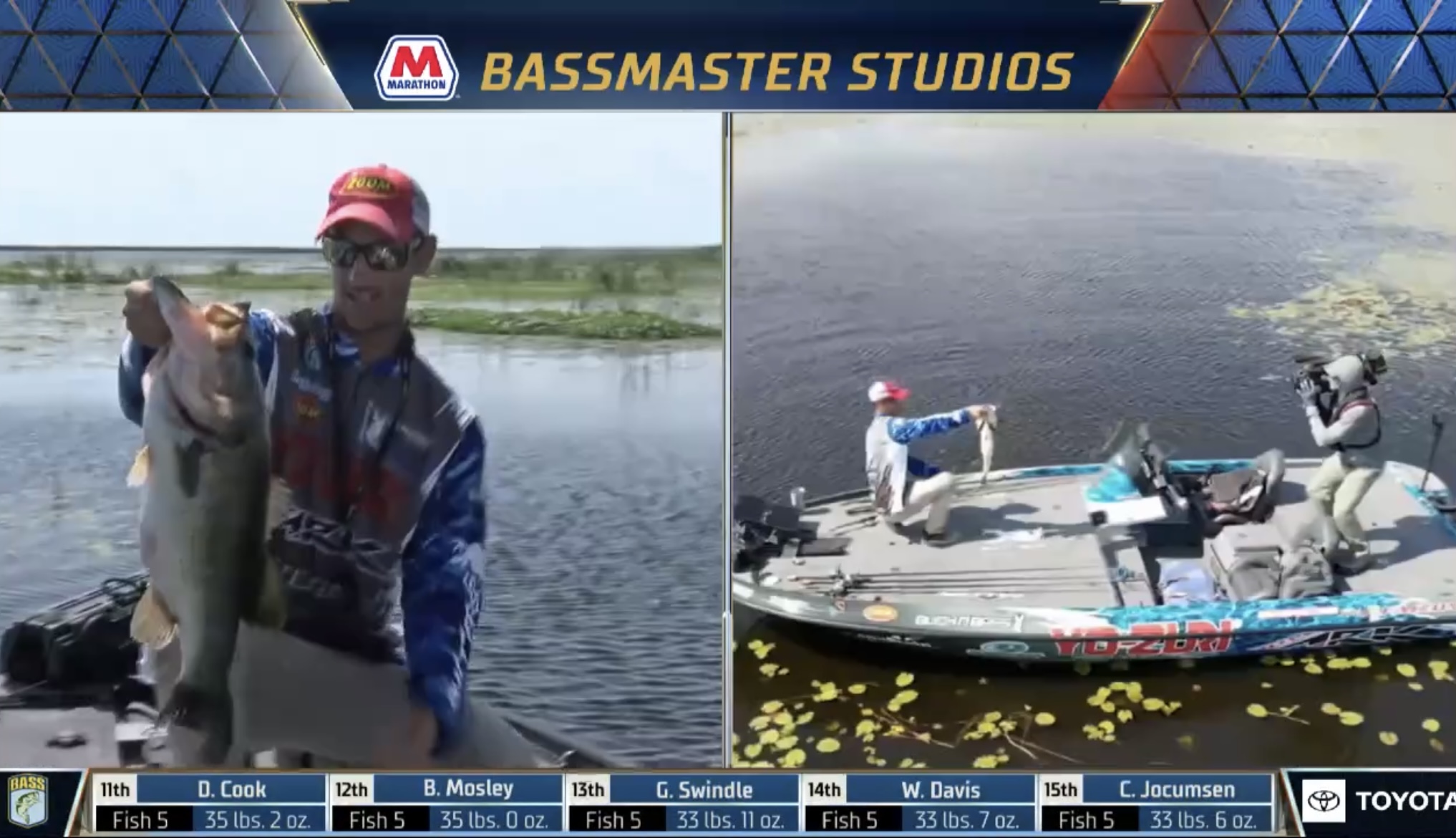 Tyler Rivet immediately followed suit culling a 3- pound bass with a 6- pounder. Continuing his forward facing sonar clinic. Wow, wow.