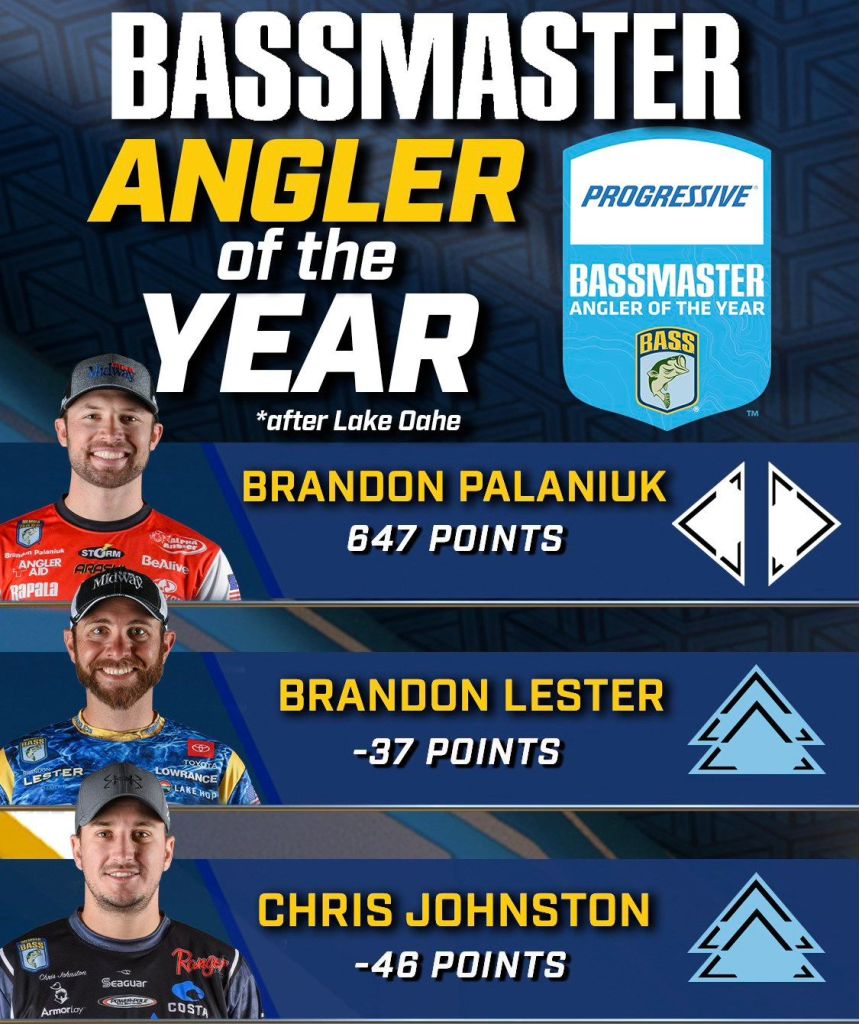 In the eighth tournament of a nine-event Bassmaster Elite Series season, Brandon Palaniuk finally finished lower than 26th place. And it was significantly lower at South Dakota’s Lake Oahe, as in 66th place. However, the two anglers closest to catching Palaniuk in the Progressive Bassmaster Angler of the Year race – second-place David Mullins and third-place John Cox – stumbled even further. Mullins finished 75th, and Cox was 77th.
