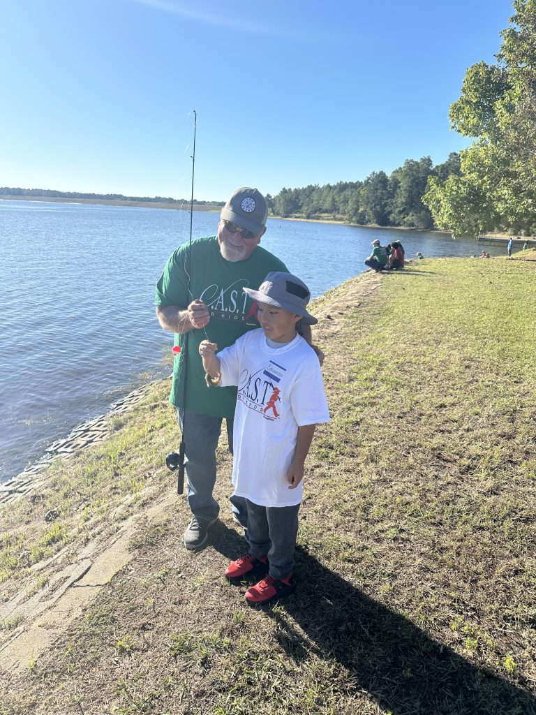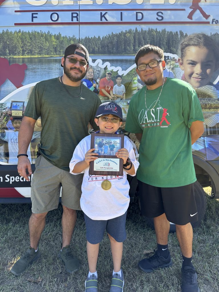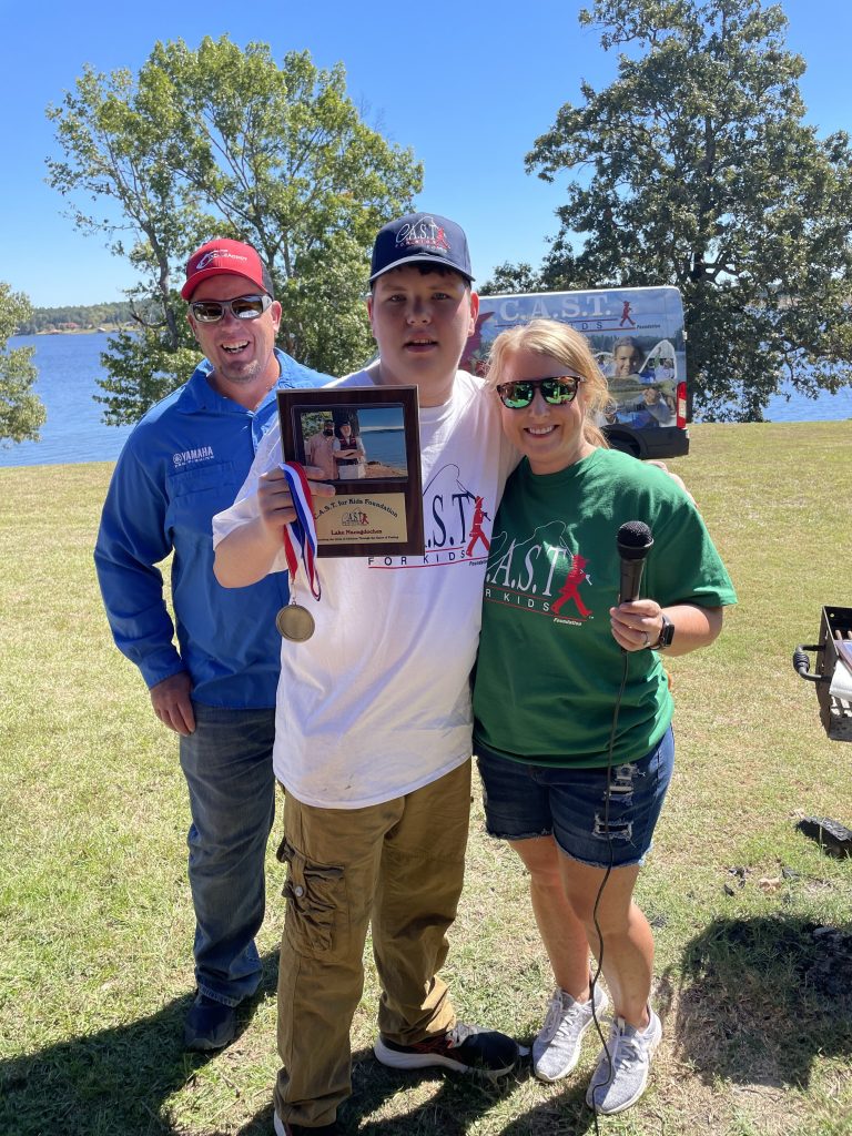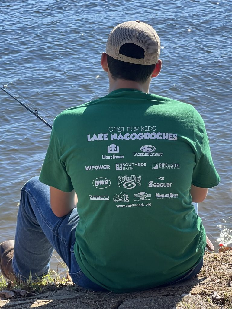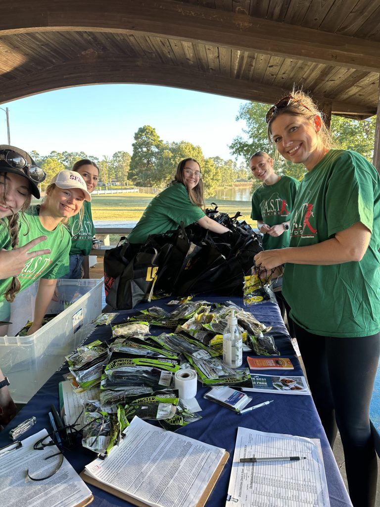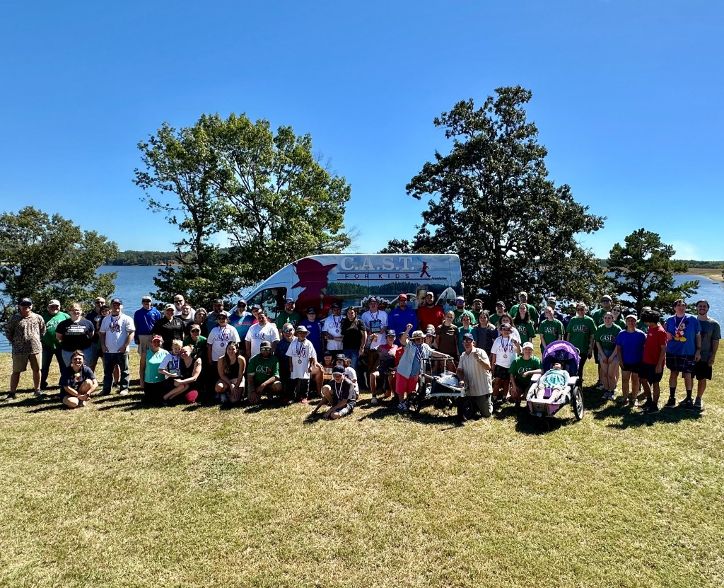 On Saturday, Keith and Jennifer Combs hosted a shoreline CAST For Kids fishing event at Lake Nacogdoches. 30 special children spent time fishing and taking boat rides with their volunteer fishing coaches. Every child was celebrated with an award plaque and medal, and they all took home a rod, reel, tackle box, t-shirt, hat, and swag bags full of products from Strike King, Lews, Seaguar, and Tackle Addict. Loving Toyota treated all of the children, their families, and all volunteers to a BBQ lunch.