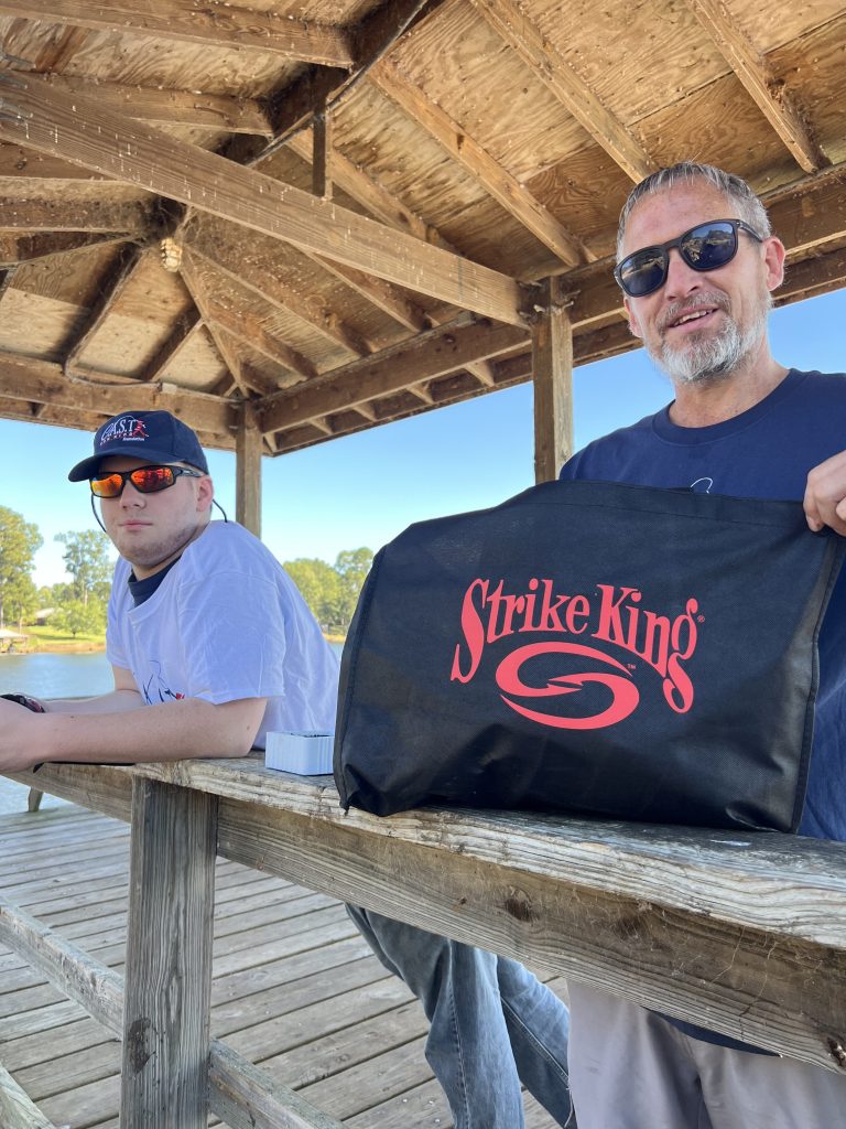 Jaden and his dad checking out what’s in the Strike King swag bag.