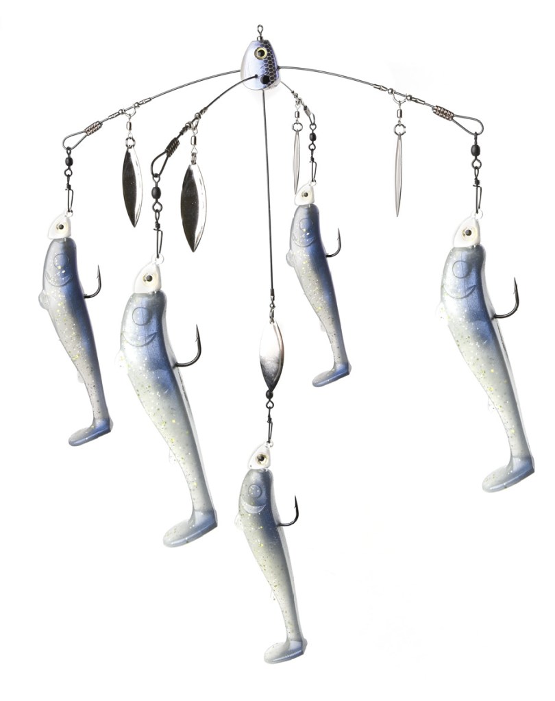 Many states limit the number of hooks allowed on an umbrella rig. “Dummy” swimbaits are fastened on jigheads without hooks or on Hitchhikers that twist onto the lure head.
