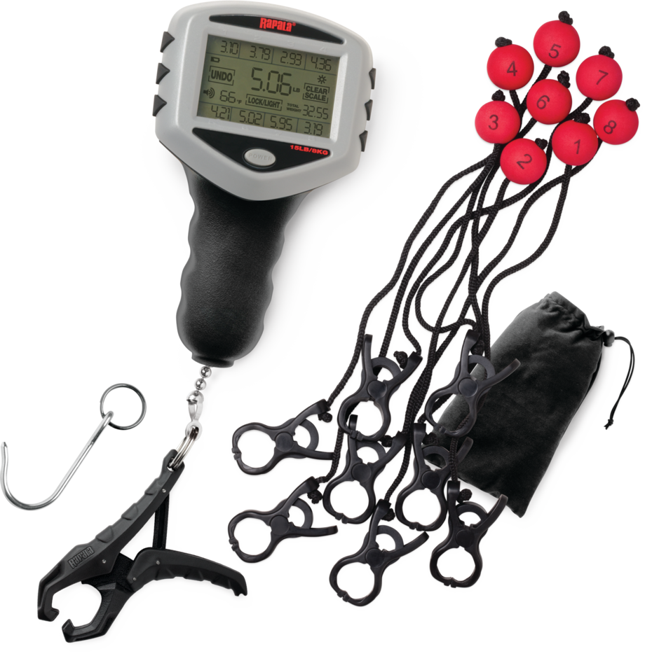 The Touch Screen Scale adds ease and convenience to weighing and tracking your catch. Large digital scale is packed with features, yet intuitive in use. Displaying weight in lbs./oz., decimal lbs. or kg., easily record and determine the position of current catch in your weight total. Simply hang catch from heavy-duty composite clamp, or included stainless steel hook to view weight. Tap on one of eight storage locations to enter fish into memory and add to total catch weight. Runs up to 400 hours on two AA batteries (not included). Back-up memory retains stored data in battery power is lost. Includes a 15lb. digital scale, plus an eight-piece culling system that allows easy management of your catch. Quickly record and determine the position of current catch in your weight total. Culling system permits easy identification of fish to be released for maximum total weight. Includes storage bag with sewn in instructions. $73.99. Rapala.com
