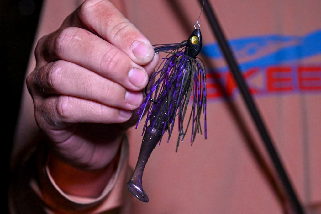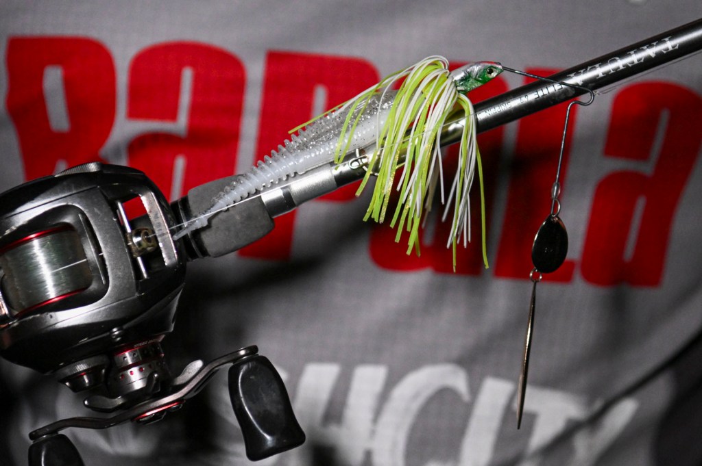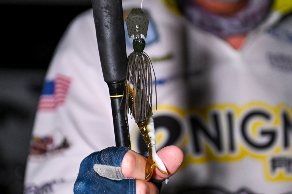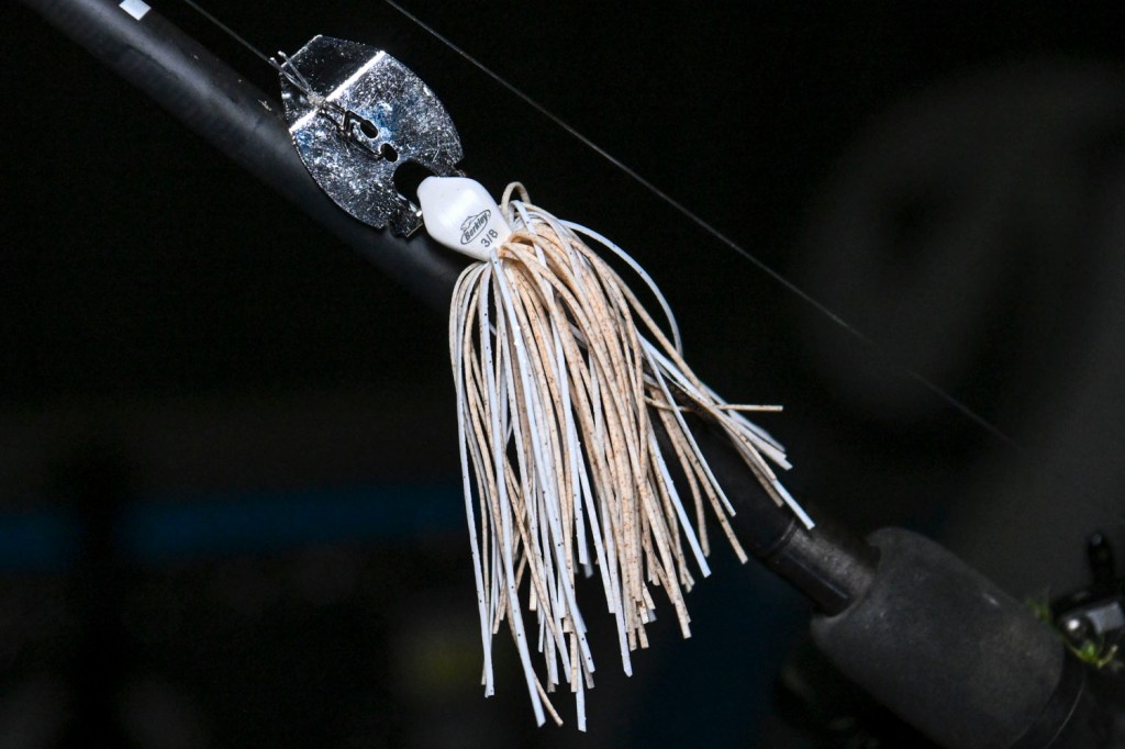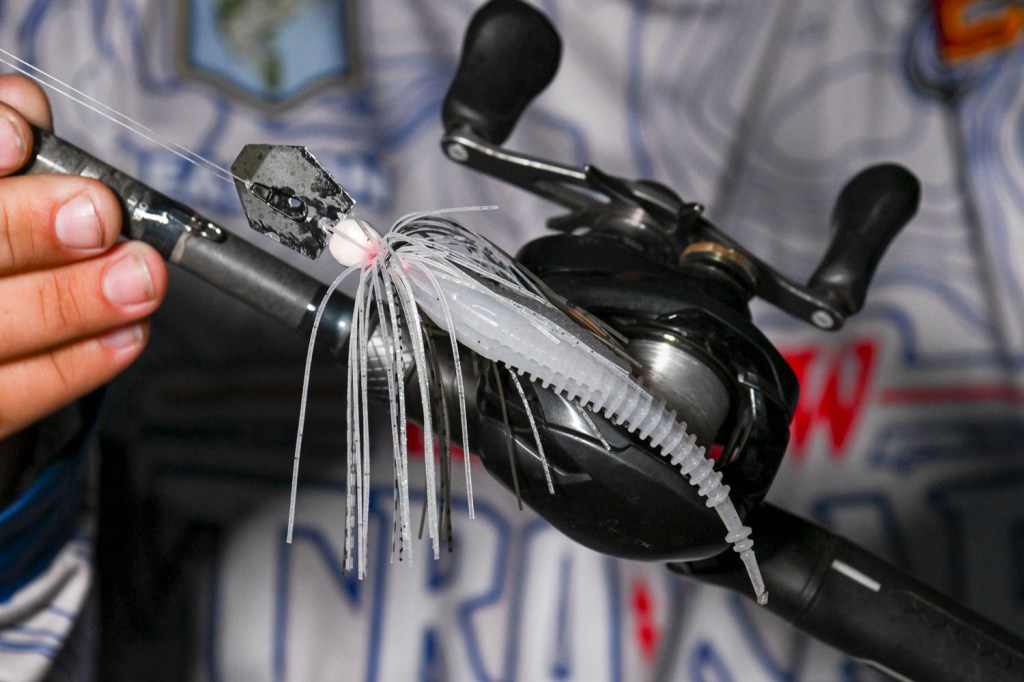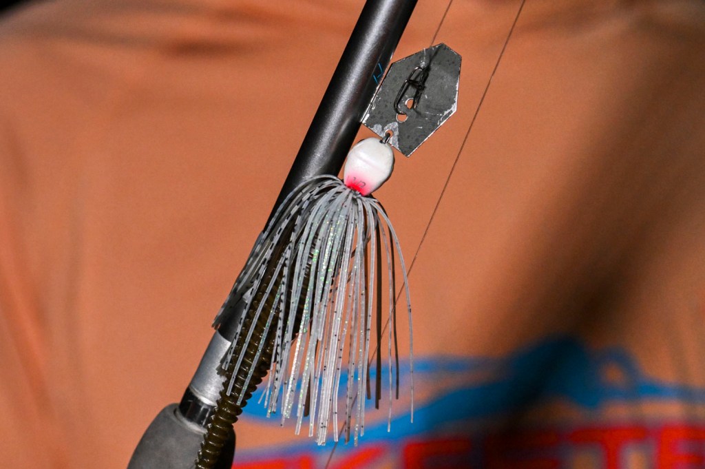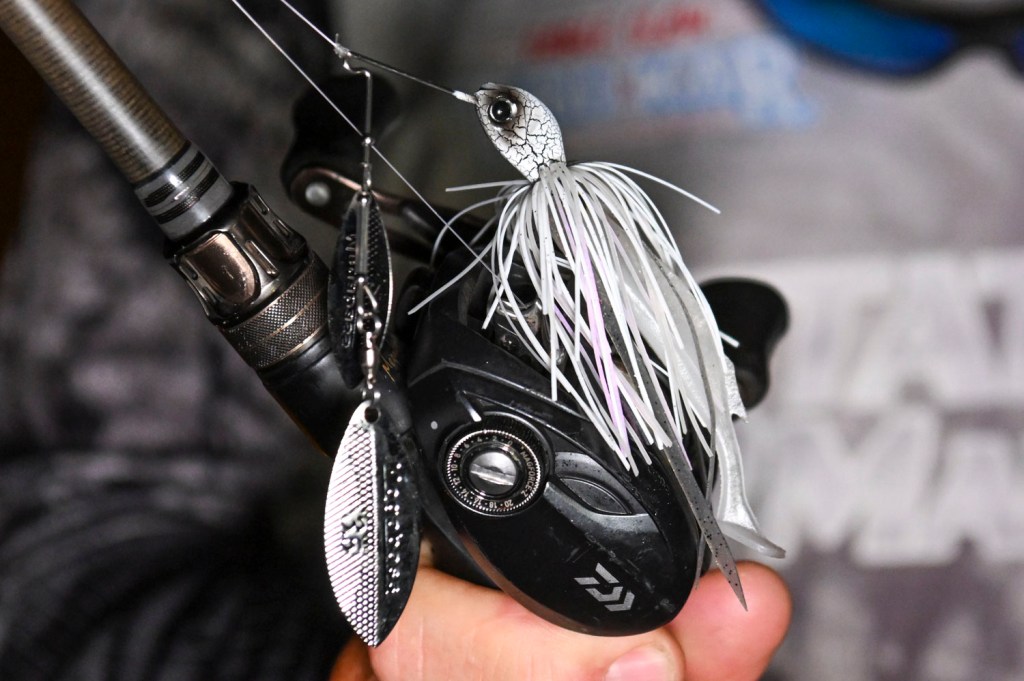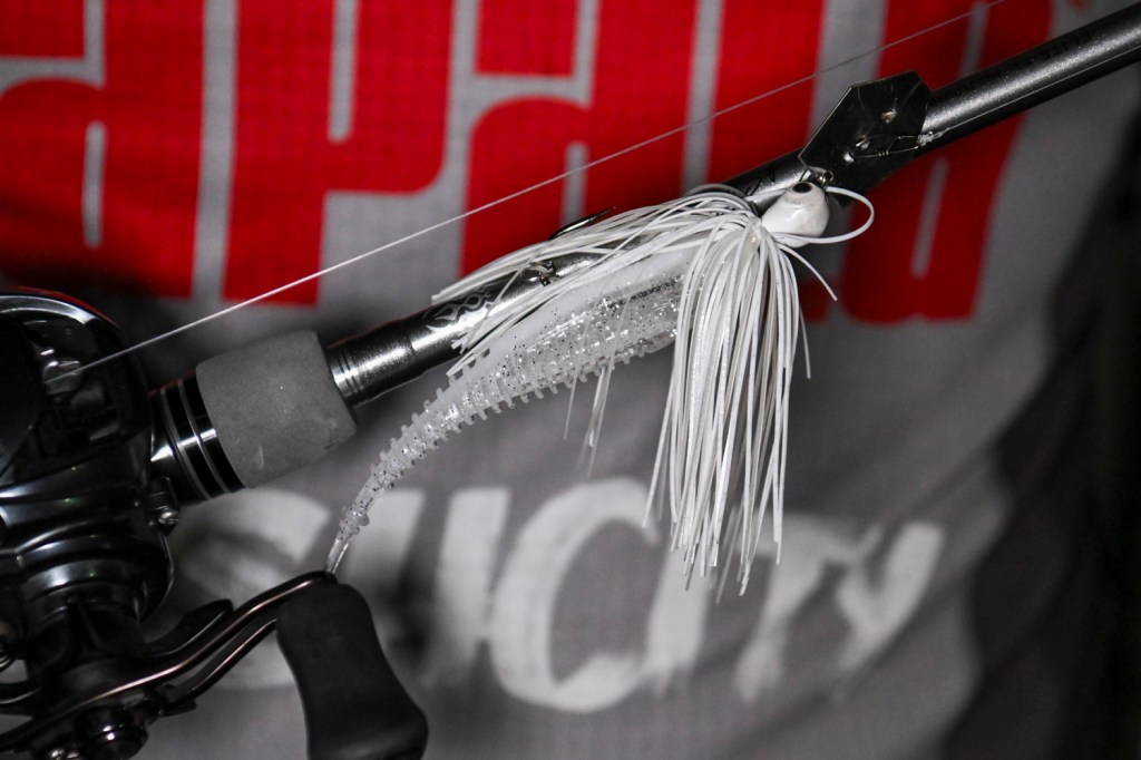 Bragg also implemented a combo of moving baits. The first was a 3/8-ounce Megabass SV-3 with dual silver willow blades in White Python color.