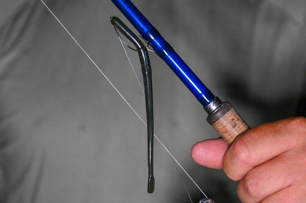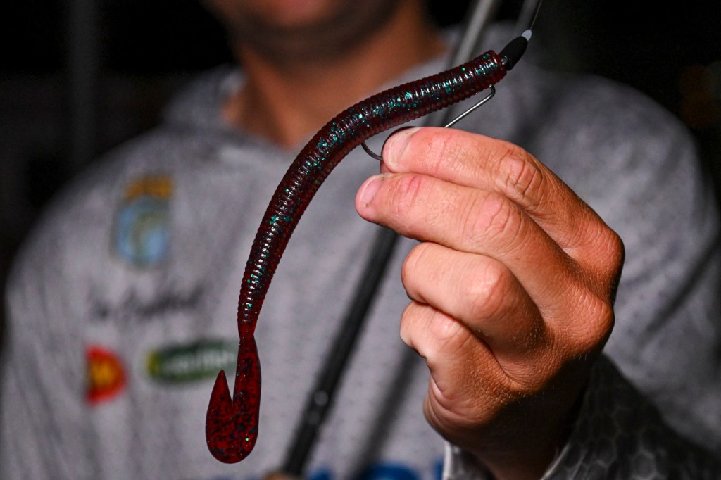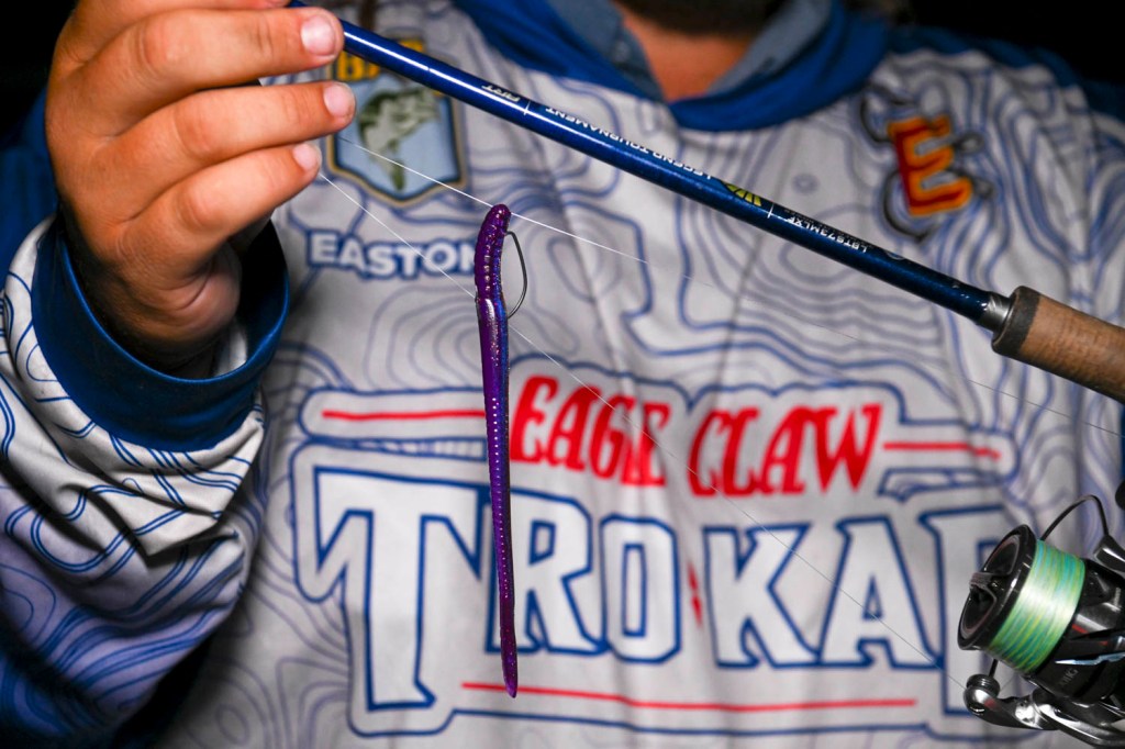 He then slowed down and followed up with a drop shot consisting of a 7-inch Roboworm Fat Straight Tail Worm (Margarita Mutilator), a 1/0 Trokar EWG worm hook and a 1/4-ounce lead drop-shot weight