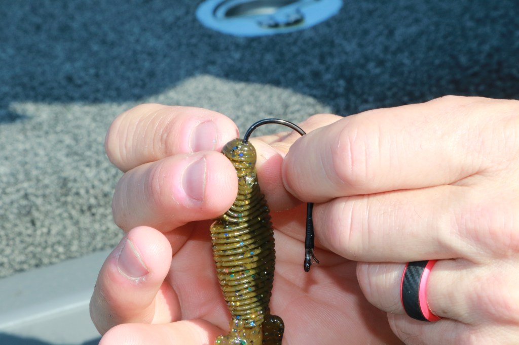 This ensures proper alignment by covering the hook’s neck — the straight section between the eye — and the outward flaring shank. Re-inserting the hook point into the bait’s body protects it from snagging for the classic weedless presentation.