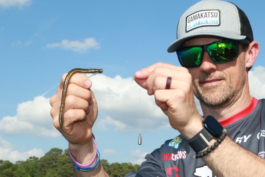 Before tying on the hook, Crews adds the appropriate size bullet weight to his line. As the hook name implies, he’s flipping or pitching his bait into dense habitat; anything from matted grass, to pads, to laydowns. The heavier the cover, the heavier the weight and with a “keeper” built into the hook, the bait stays in place as it moves in and out of cover.