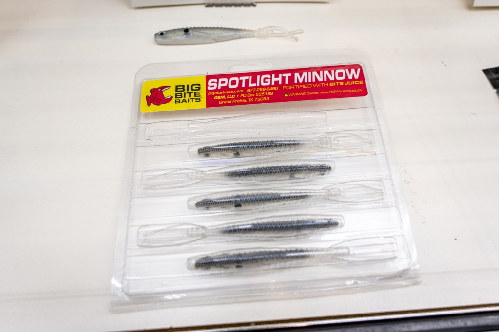 The Spotlight Minnow, designed by Big Bite Baits pro Drew Gill, is tailored for Forward Facing Sonar. Finding fish is one thing – making them bite is another, and this is where the Spotlight Minnow shines. A hollow body design and wedge-angle tails allow for superior action, movement and hookups. In fact, the tip of the tail is tapered to catch water and is slightly off-center, resulting in a bait that rolls beautifully.