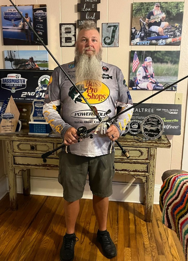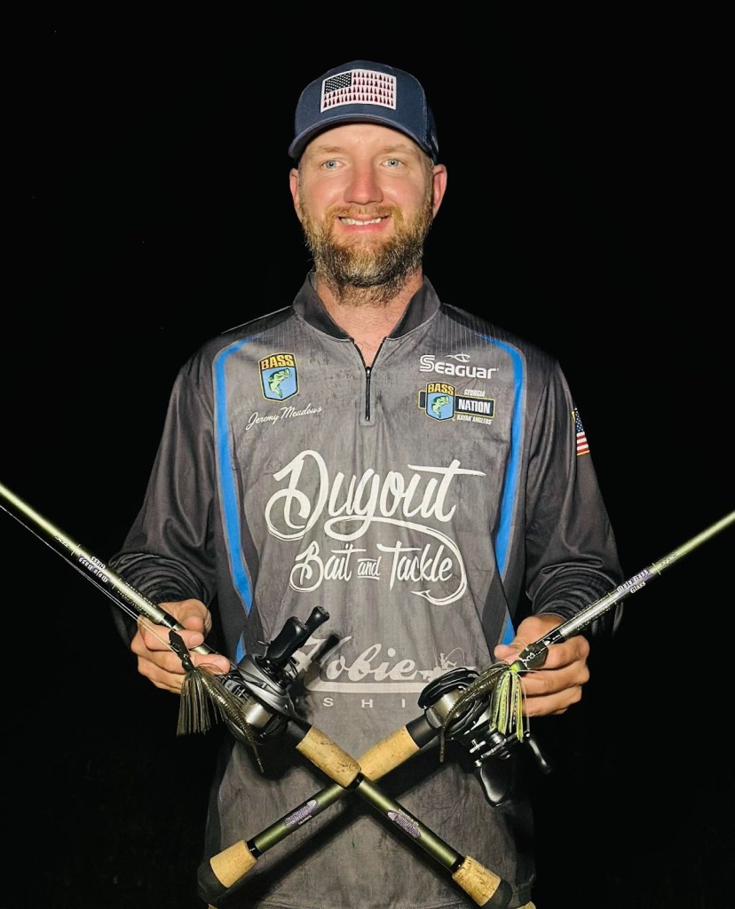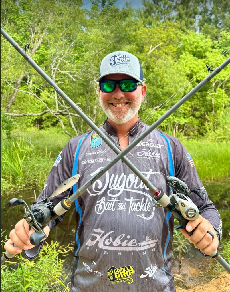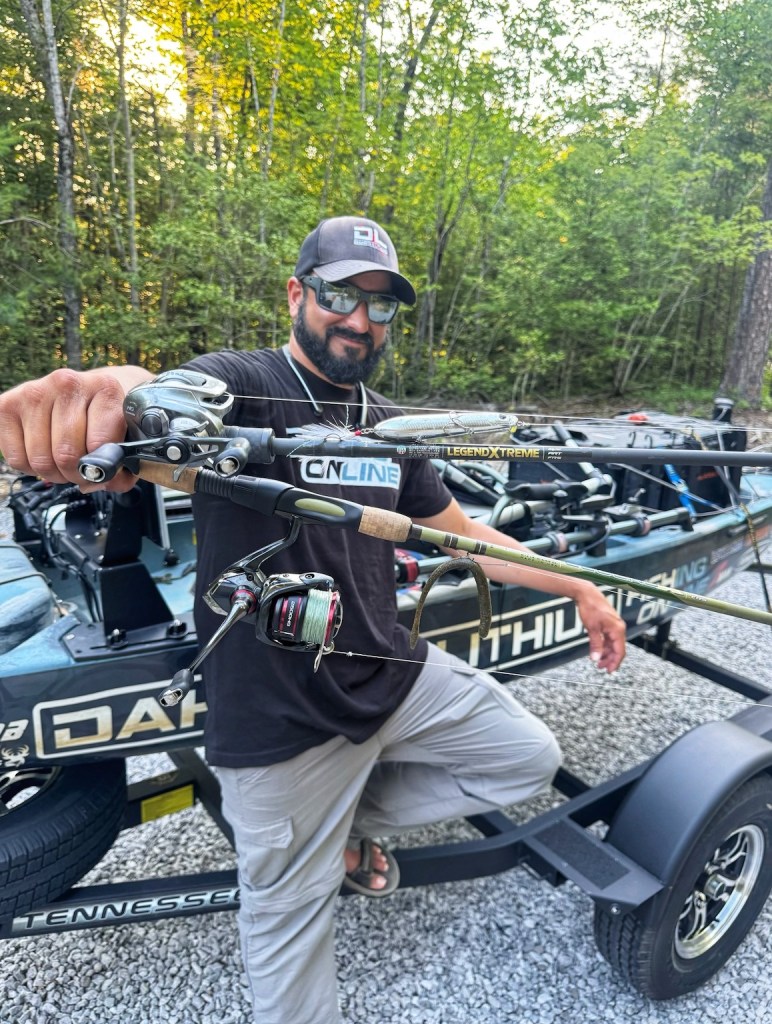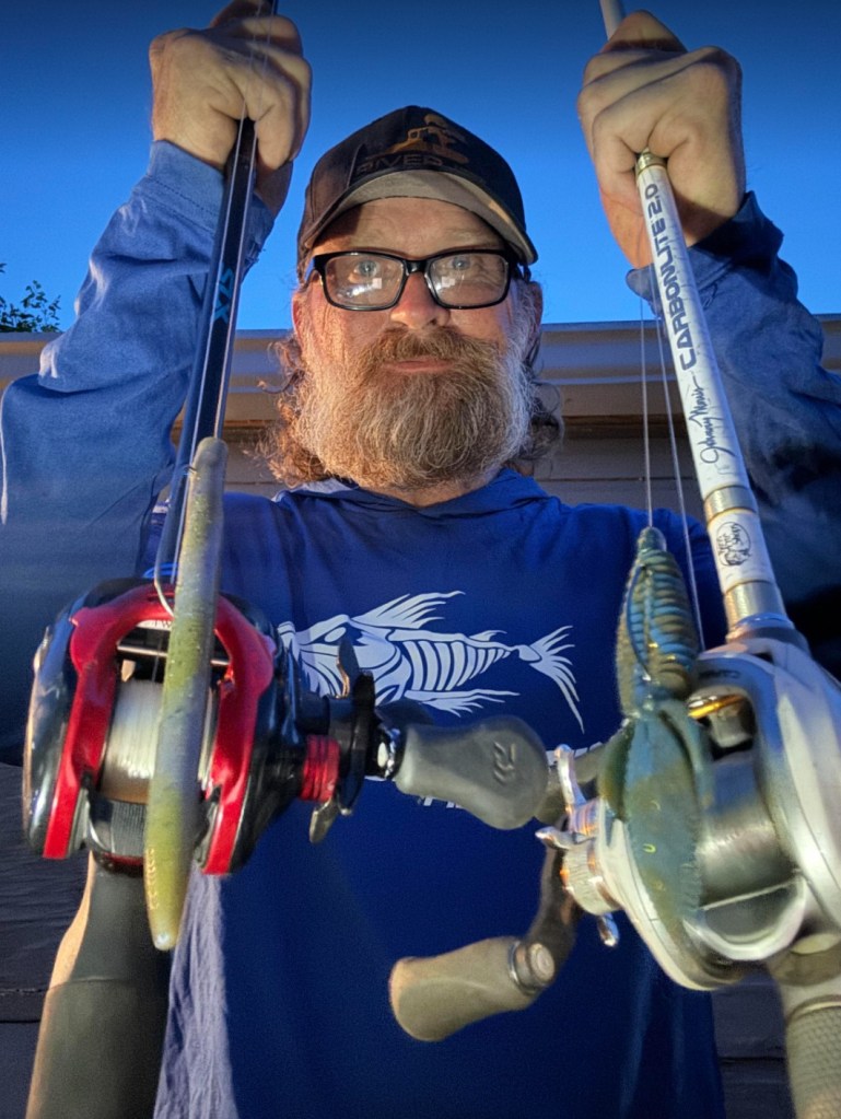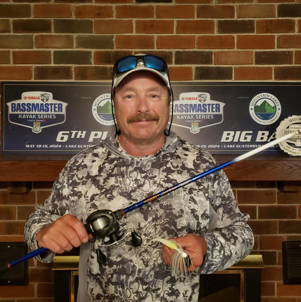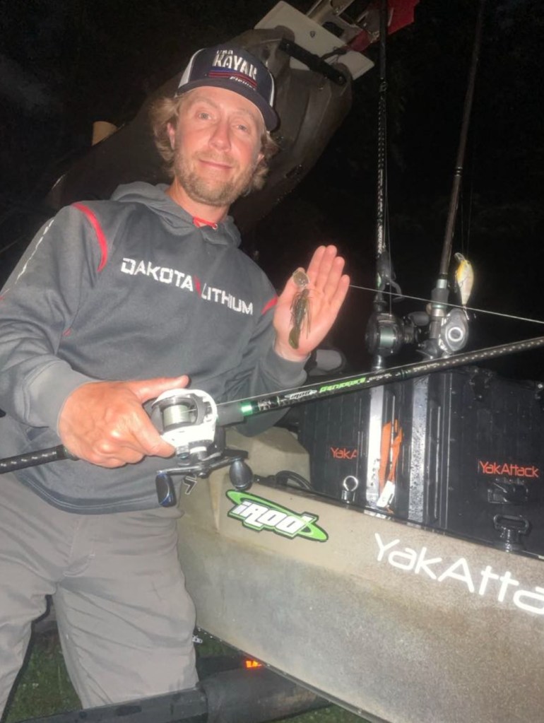 His other presentation was with a Shimano 6’7” medium heavy rod with a Diawa Tatula-R loaded with 15 lb. P-Line and a Bass Pro Shops XPS Offset Round Bend Hook. On Day 1 he used the Bass Pro Shops Tournament Series Stick-O-Worm in Bue Craw and after using them all up went to the Water Front Bait and Tackle and found a Reaction Innovation Pocket Rocket 5.5 Magic Craw for Day 2 which was close in comparison to his Day 1 bait.