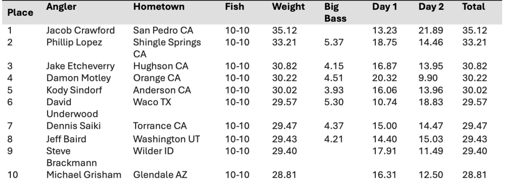 2025 WON Bass Lake Shasta Open Day 2 AAA Standings
