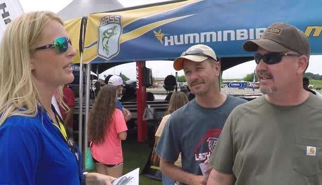 Emily Tucker, wife of Elite Series pro J Todd Tucker, interviews fans and anglers at the Academy Sports + Outdoors Bassmaster Elite at Wheeler Lake event.